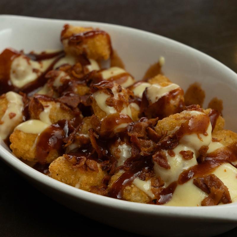 1/2 pound of tater tots, covered in local creamy Gouda cheese with bacon bits & drizzled with BBQ sauce.